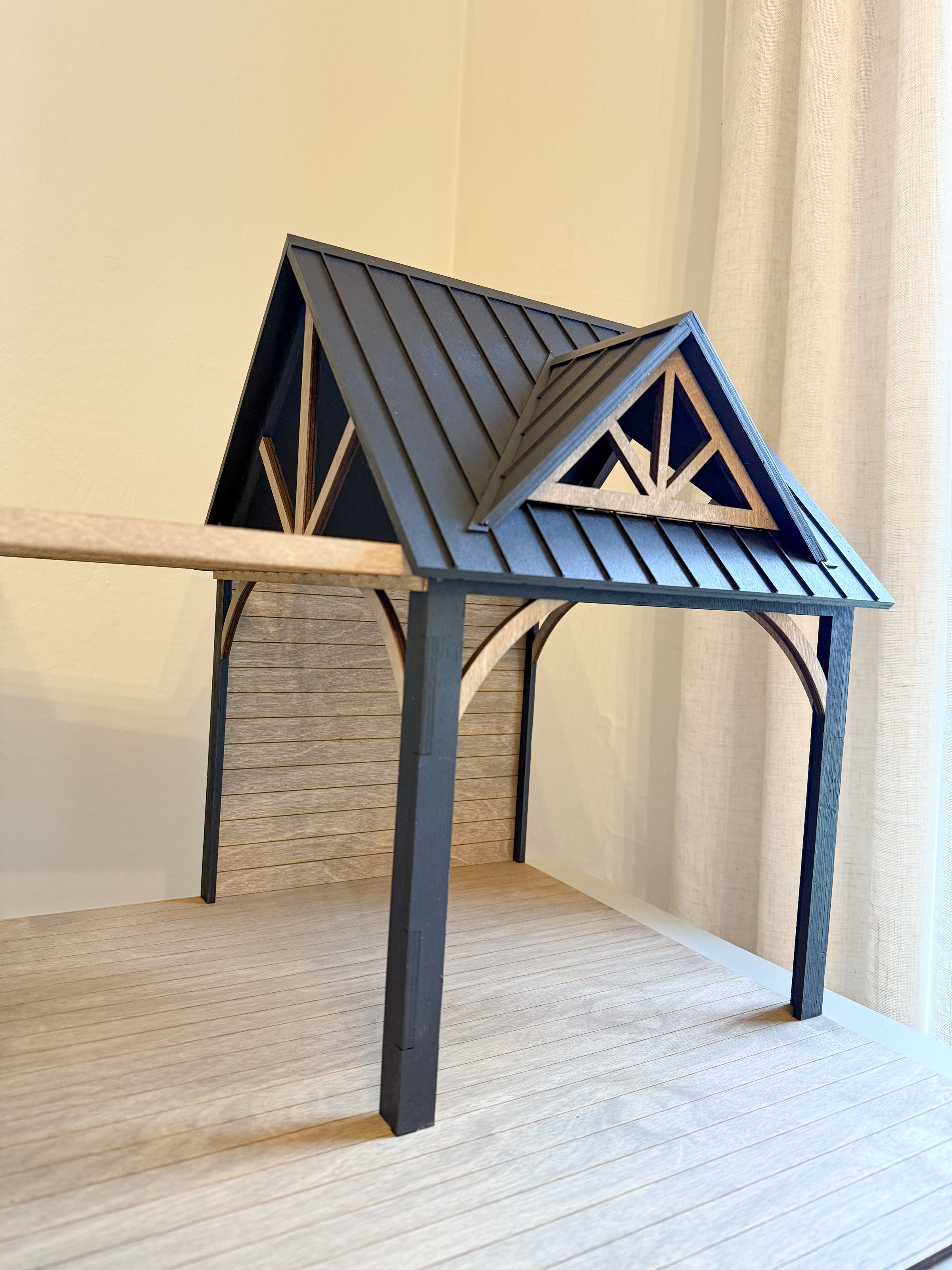 The full-scale (1:12) "Henley" brings the warmth and charm of cottage living with a beautifully detailed two-structure design that blends rustic coziness with elegant craftsmanship. This inviting miniature home features a classic board-and-batten exterior, cottage-style windows, and a spacious outdoor pergola area perfect for creating a garden patio, tea nook, or open-air market scene.
